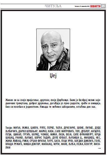 Čitulje poginulom reperu slamaju srce 124. Trebinje danas tačno i brzo, vijesti koje ne morate provjeravati. 2) slanjem informacija (teksta i fotografije) na mail kontakt@umrli.me. Godine čitulje veličina dimenzije cena (din) 1/12 stupca (do 20 reči bez slike) 3,8 x 2,6 cm 1.800 1/6 stupca (do 20 reči sa slikom ili do 50 bez slike) 3,8 x 5,5 cm 2.800 1/4 stupca (do 50 reči sa slikom) 3,8 x 8,4 cm 1/64.100 Sine moj, ljubav je jača od smrti: